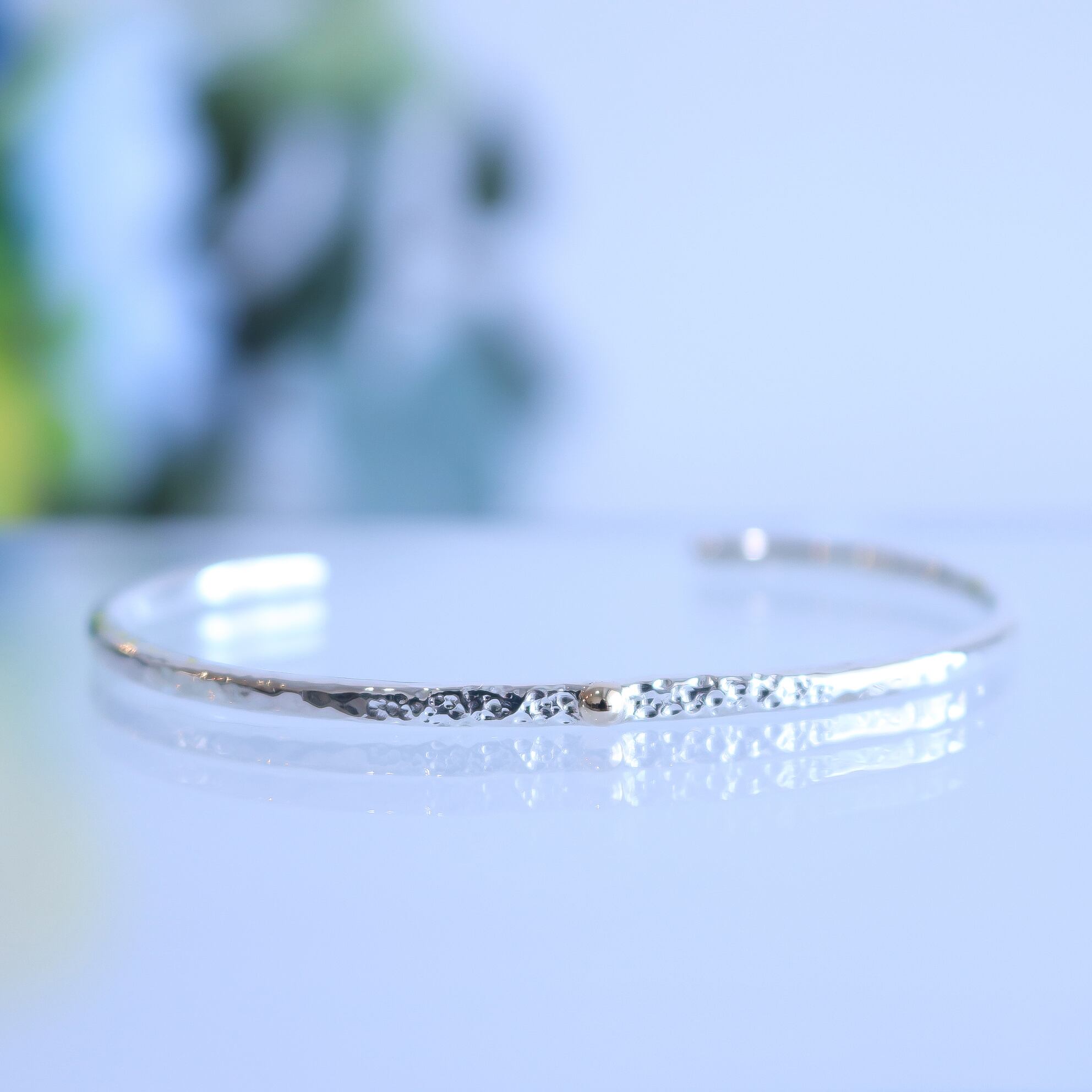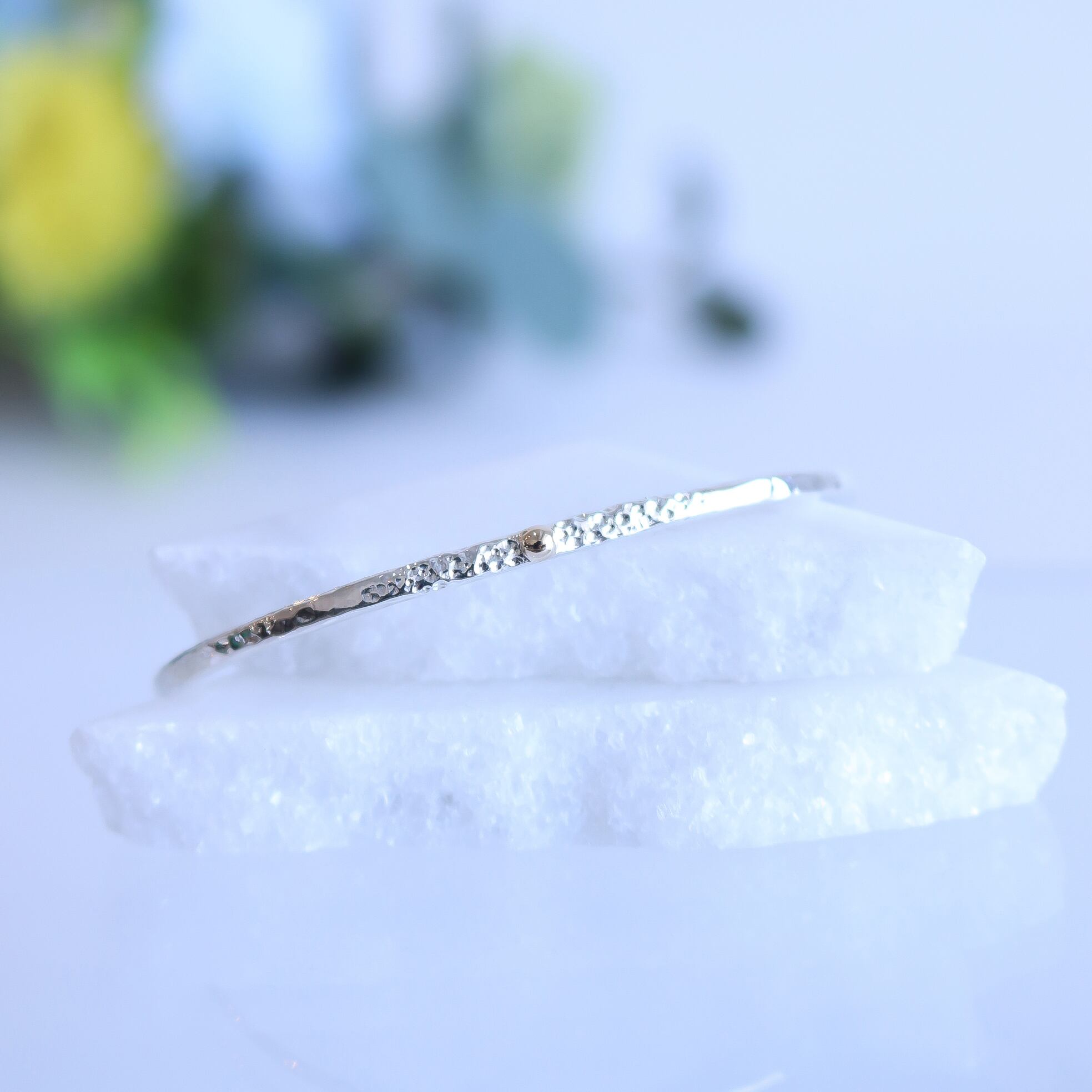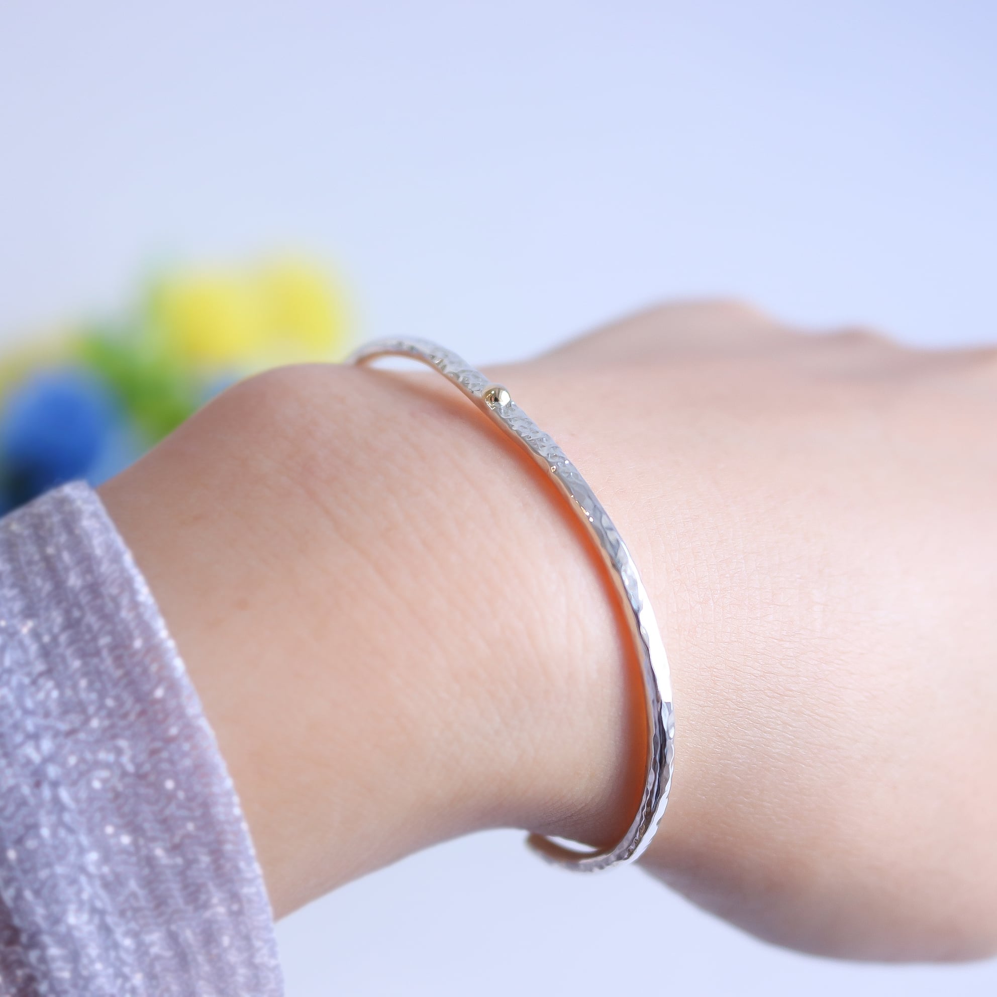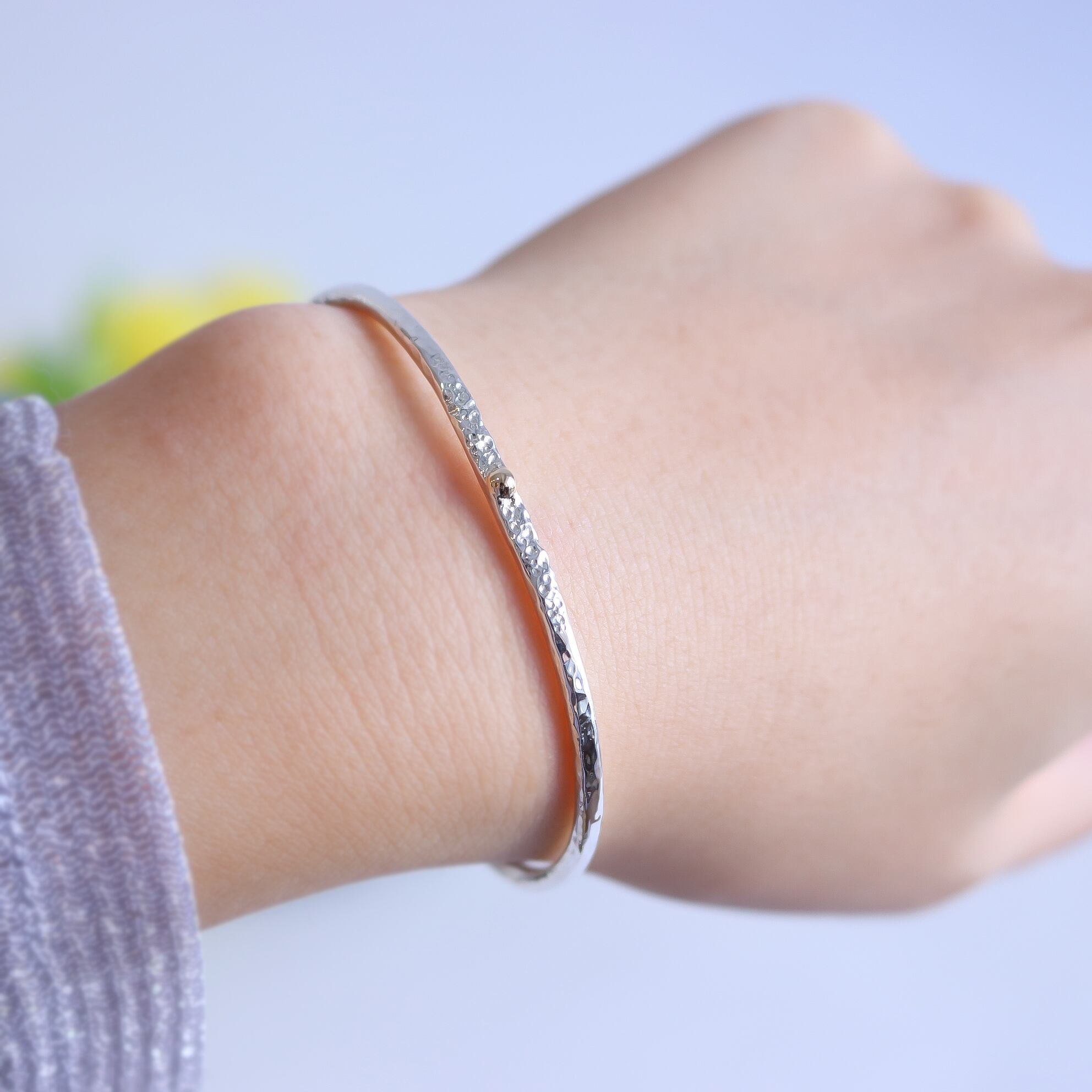 シンプルなシルバーのバングルにK10の粒がワンポイント!一つでも存在感を放ちながら、お手持ちのアクセサリーとの相性も抜群です!軽やかな着け心地で、手元をさりげなく美しく演出します。カジュアルなシーンから特別なイベントまで幅広くご利用いただけます。シンプルな中に個性を感じさせるこのアイテムをぜひお楽しみください。