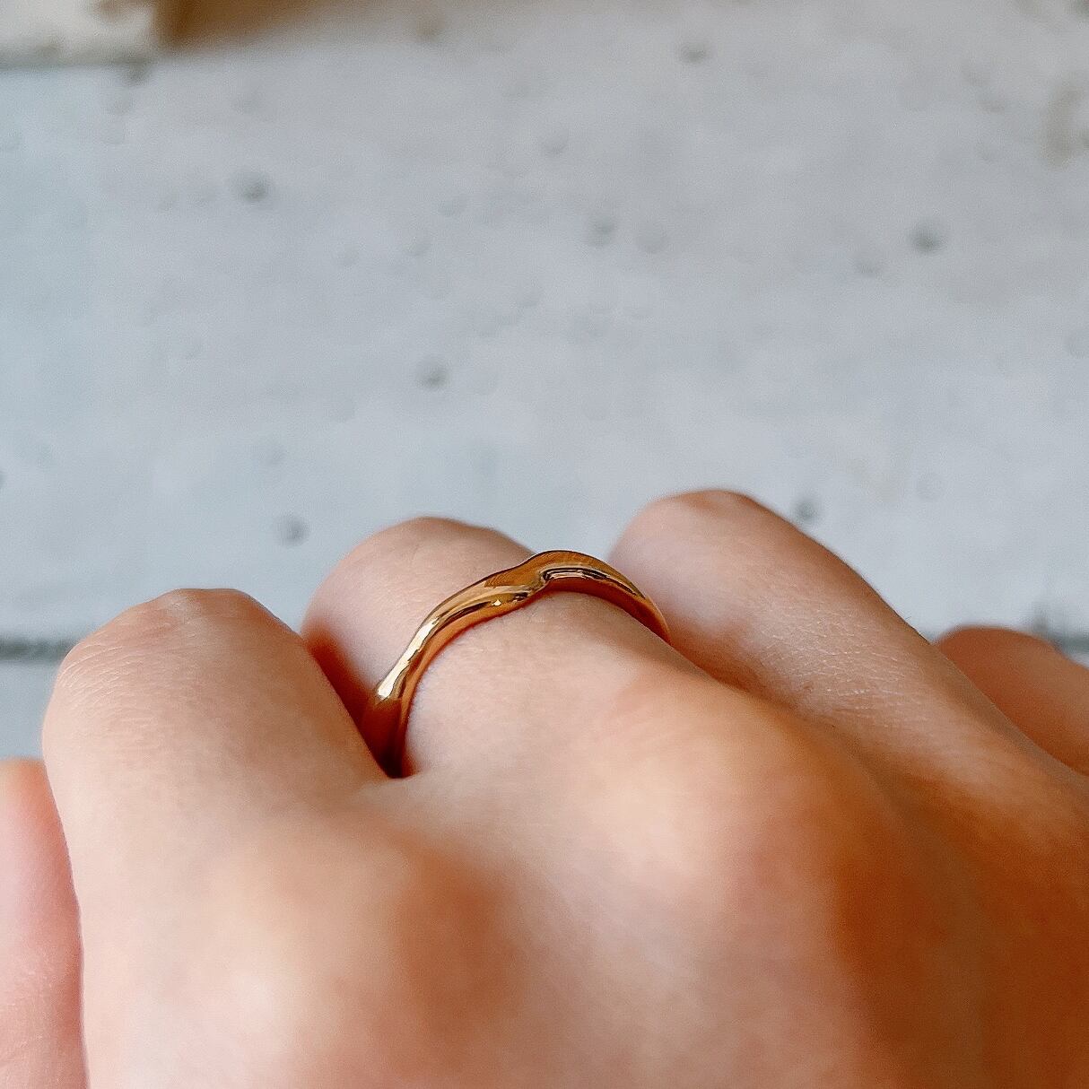 不規則なウェーブと太さで、着用する向きによってイメージが異なるため様々な表情をお楽しみいただけます。華奢な細さなので、一本でシンプルに着けても、重ね付けにしても可愛いリングとなっております。